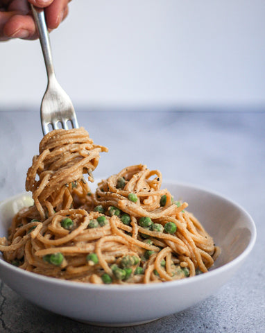 3. Um die Soße zuzubereiten, gebe alle Zutaten (abgesehen von den Spaghetti und den Erbsen) mit etwa der Hälfte des zur Seite gestellten Nudelwassers in einen Mixer und püriere alles, bis die Sauce glatt und cremig ist. Wenn dir die Sauce noch etwas zu dick ist, füge einfach noch etwas Nudelwasser hinzu und mixe sie noch einmal durch.